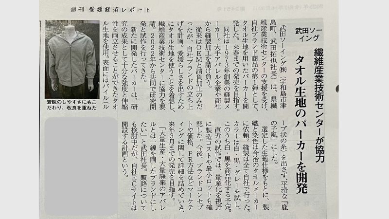先日、愛媛経済レポートさんに、開発してきた商品についての取材をいただきました。武田ソーイングでは、タオル生地開発からの最初の製品としてパーカーを選択しました。これまで今治のタオル生地でのTシャツは作られてきましたが、おそらくパーカーなどファッションアイテムとしての展開は事例が少ないため注目していただいたのかと思います。